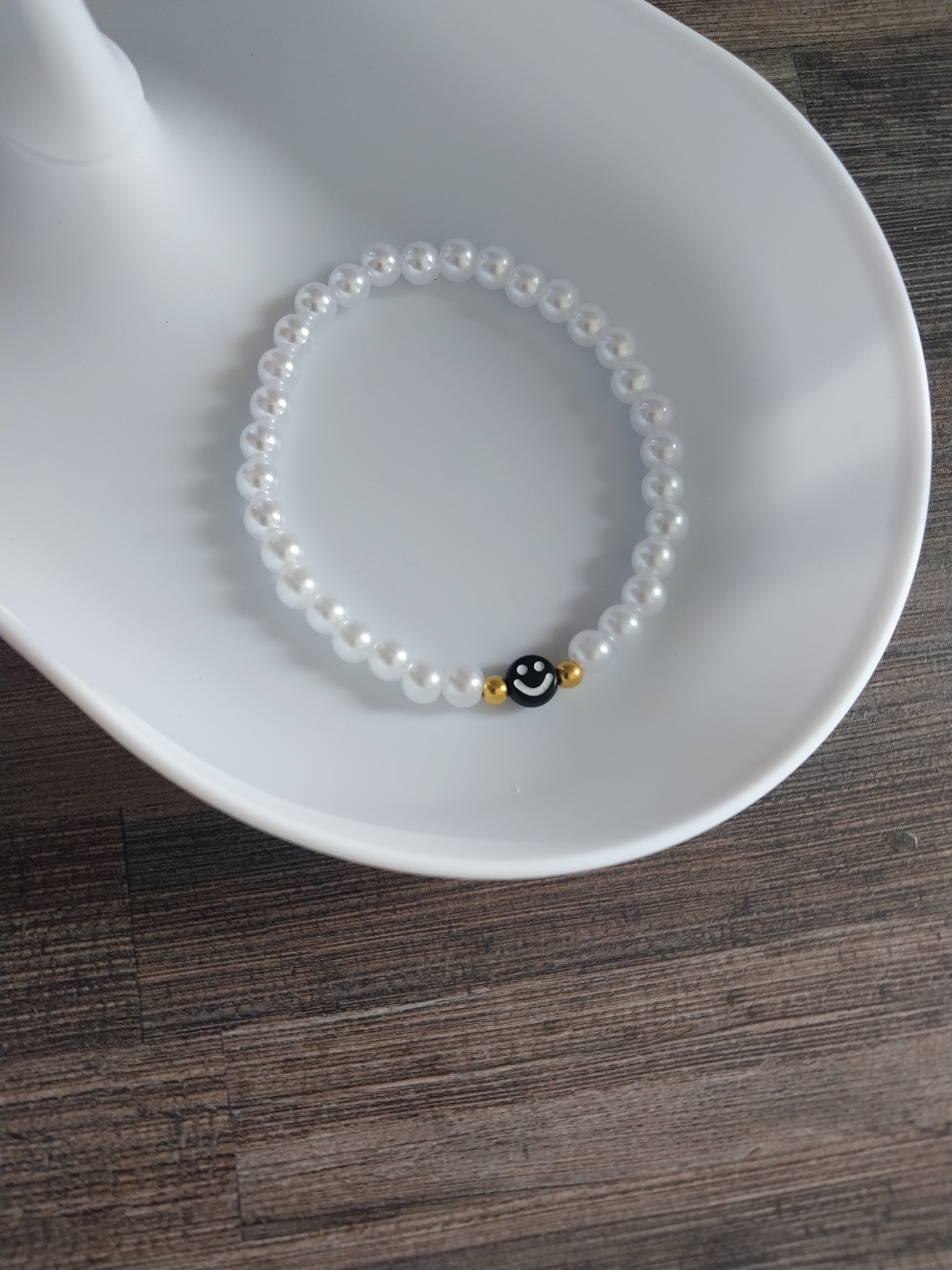 White faux pearl bracelet with black smiley face charm.