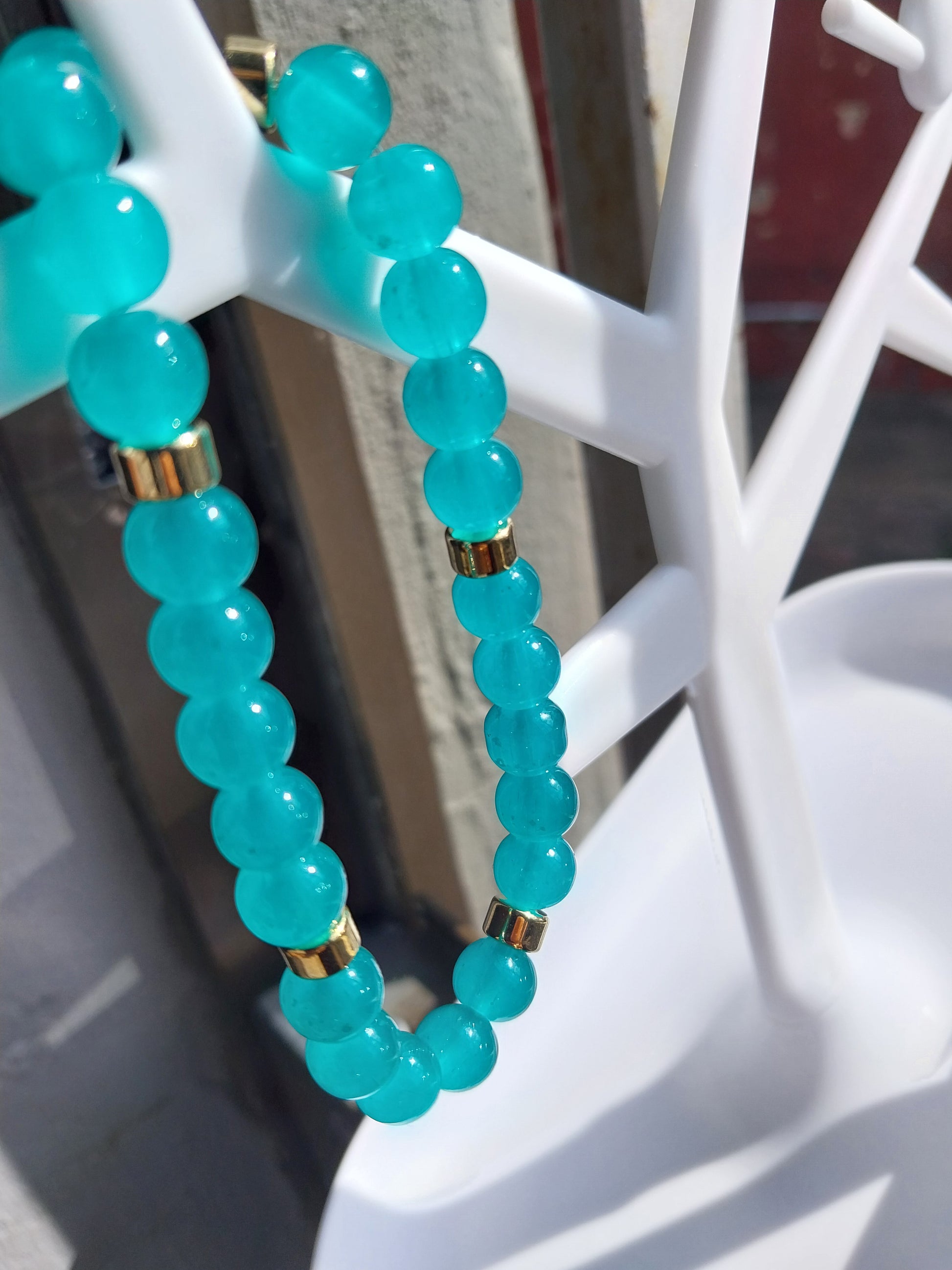 Jade glass beads with gold spacers.