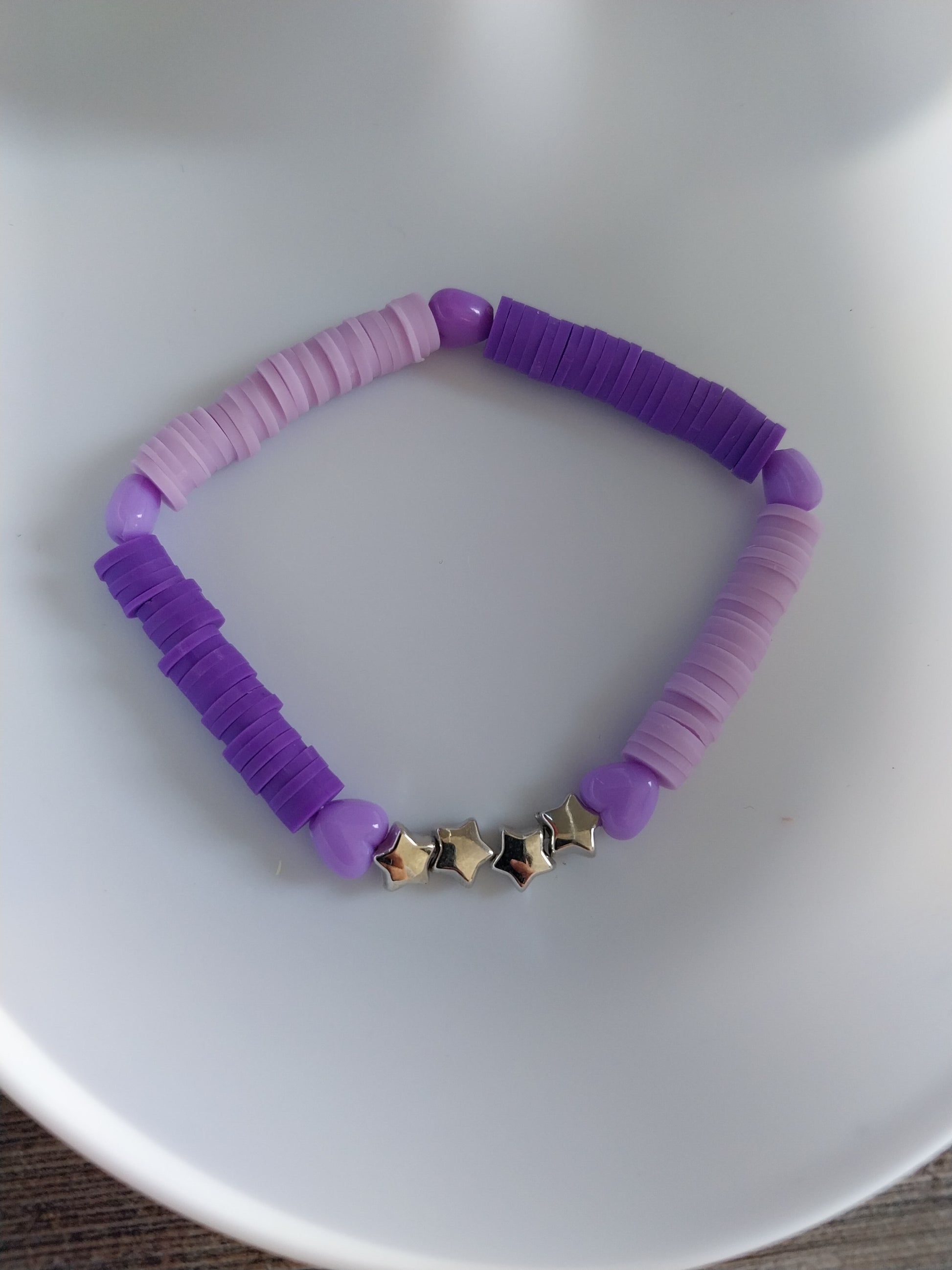 Purple clay beads with silver star and purple heart charms.